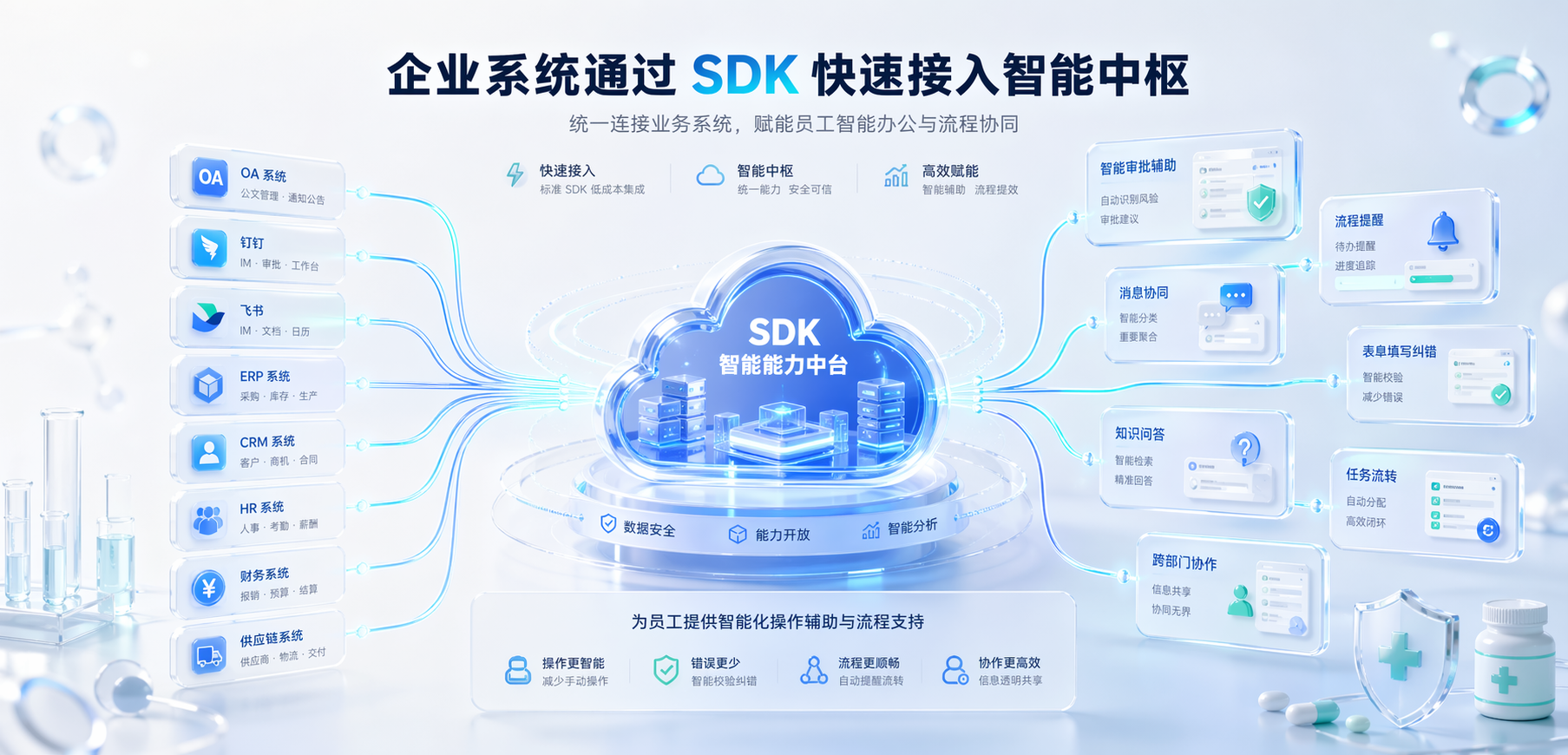 基于企业私有化部署的智能体中枢,打通内部知识库、业务数据库、互联网信息源及行业算法库,通过动态组合这些工具链驱动工作流,为金融、医疗、能源等行业提供全栈式认知自动化解决方案。